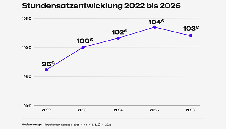 Der durchschnittliche Stundensatz für Freelancer liegt leicht unter Vorjahresniveau, trotzdem planen 62 Prozent der Freelancer 2026 keine Erhöhung ihrer Preise. Jeder Fünfte arbeitet bis zu 50 Stunden pro Woche.
